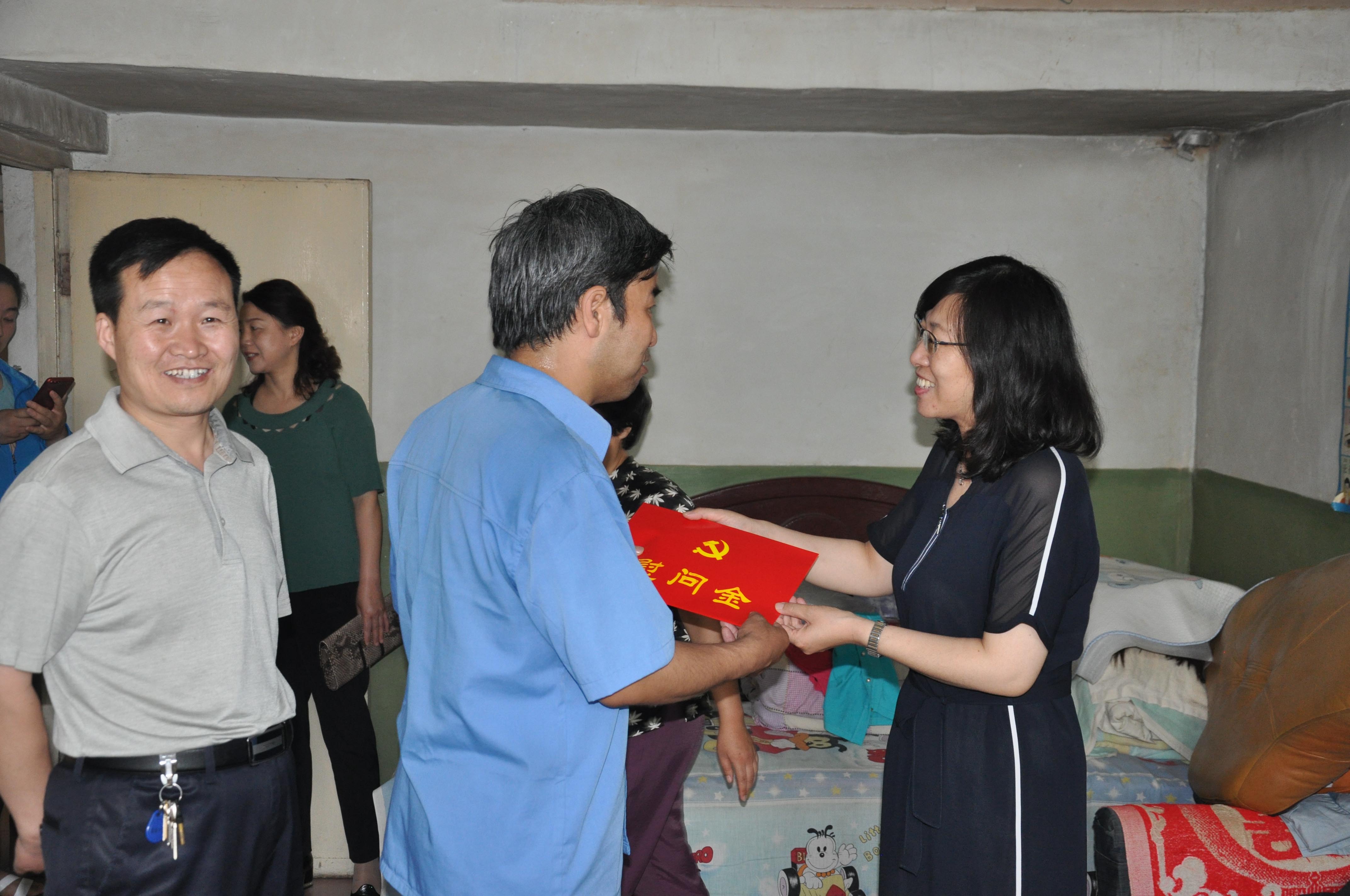 宋淑琴一行首先来到成功淮海发动机机加部工作的老党员杨宝杰的住处,当了解到老党员杨宝杰的父母都已是八十高龄和其母因患脑血管病导致生活不能自理、孩子上学花费较大、工资收入偏低,一家五口人居住在一套二居室的生活情况后,宋淑琴表示非常同情和理解,随后将1000元慰问金送到杨宝杰的手中,鼓励他要振作精神、克服暂时的困难,党组织会一直给予关注他和家人的生活。之后来到成功淮海发动机质量部工作的党员姚雪雁家中,了解到其独自抚养的女儿今年高考远超一本分数线,而家中经济拮据、十分困难的状况时,宋淑琴代表党组织送上了1000元慰问金,并叮嘱姚雪雁,党组织会全心全意帮助和关心她和她的家人的生活。从党员姚雪雁家出来后,又到成功汽车总装车间看望了正在生产一线工作的王超、王伟堂两位困难特效生。王超的父亲在家务农,体弱多病,去年其母因一场车祸去世,家中还有一聋哑的弟弟,家庭生活十分困难。另外,王伟堂父亲于去年7月去世,在家务农的母亲体弱多病,其爱人也是智障,双方有一个5岁的儿子,全家五口人靠他微薄的工资维持生计,生活特别困难。成功汽车总装车间主任董俊超分别介绍了王超、王伟堂的家庭情况及平时工作的情况,对两位在工作中的突出表现表示赞同,纷纷竖起大拇指点赞,并鼓励王超、王伟堂在成功汽车这个温暖的“大家庭”努力工作,以乐观向上的生活态度珍惜当下,有困难及时与党组织沟通,党组织将以最大能力为他们排忧解难,解决个人的实际困难。此后,分别向他们各发放了1000元慰问金。面对党组织的关怀,王超、王伟堂两位聋哑人显得非常激动,他们用聋哑人特别的交流方式表示,感激党组织关怀,将竭尽自己所能,珍惜岗位,为社会和企业的发展做出积极的贡献。