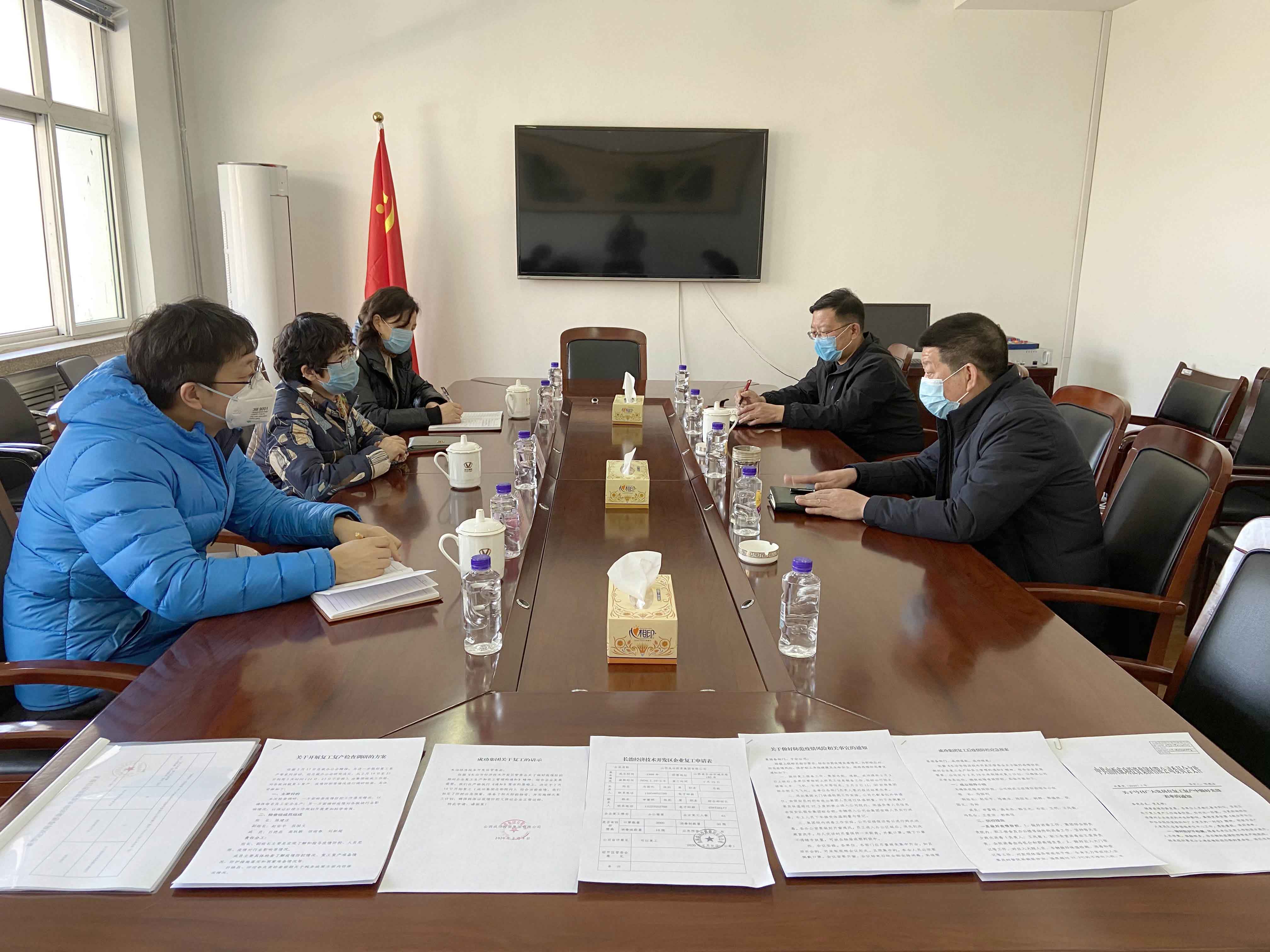 2月25日下午,长治市市场监督管理局副局长、市非公企业党委副书记马和英、长治市市场监督管理局非公党建科科员杨灵英、靳世栋一行深入Bwin必赢网站入口就复工复产工作进行了专项调研。在集团总部三楼会议室,集团党委书记陈建法向马和英一行作了汇报,党办主任申雷明全程陪同。