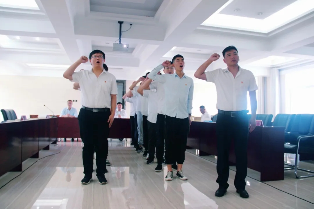 “我们是五月的花海,用青春拥抱时代;我们是初升的太阳,用生命点燃未来……”大会在嘹亮的《团歌》中启幕。团总支书记郭振兵作为领誓人,面对鲜红的团旗,带领全体团员青年高举右手庄严宣誓,在重温入团誓词的同时,回望了中国共产主义青年团的初心和使命。