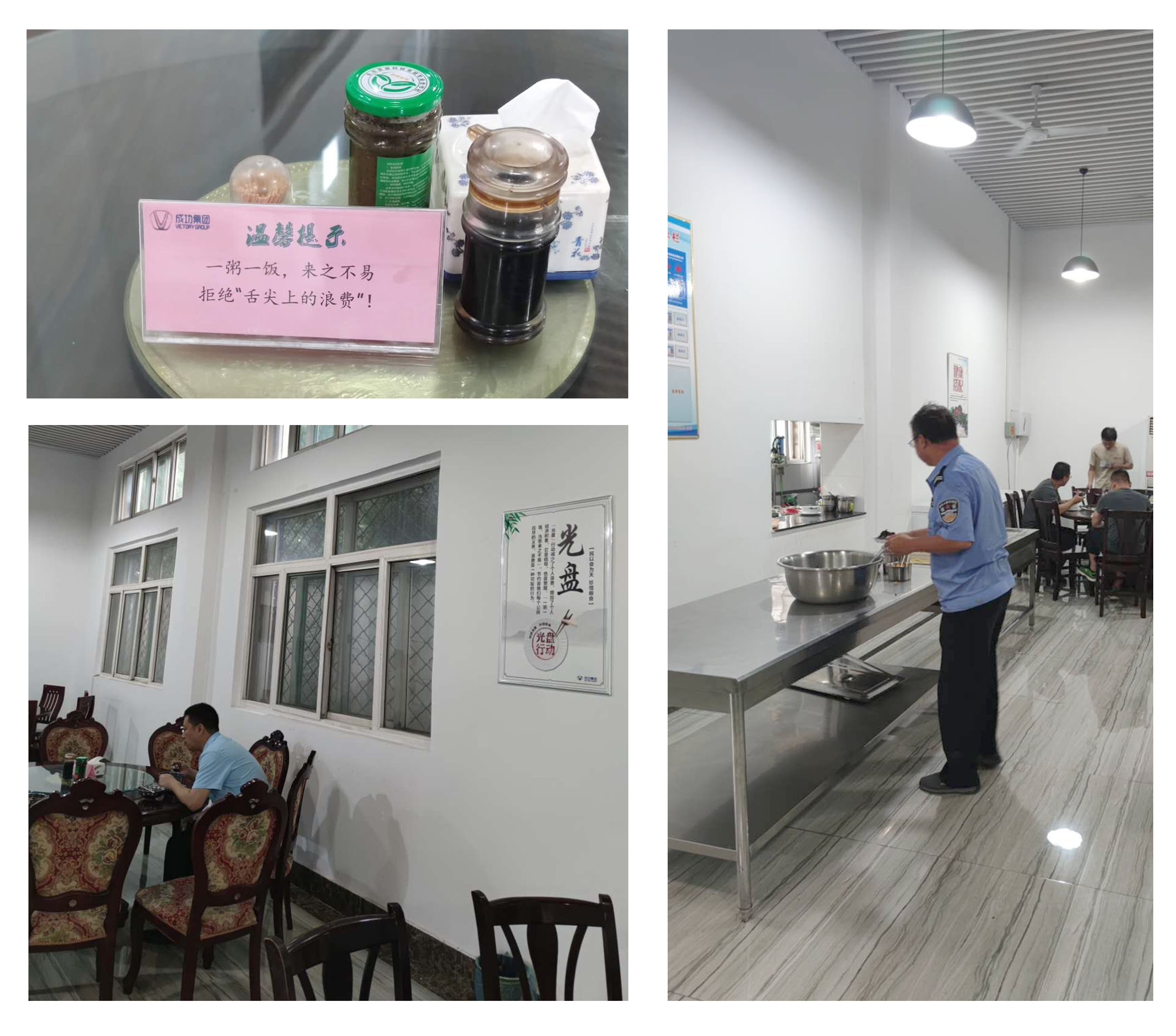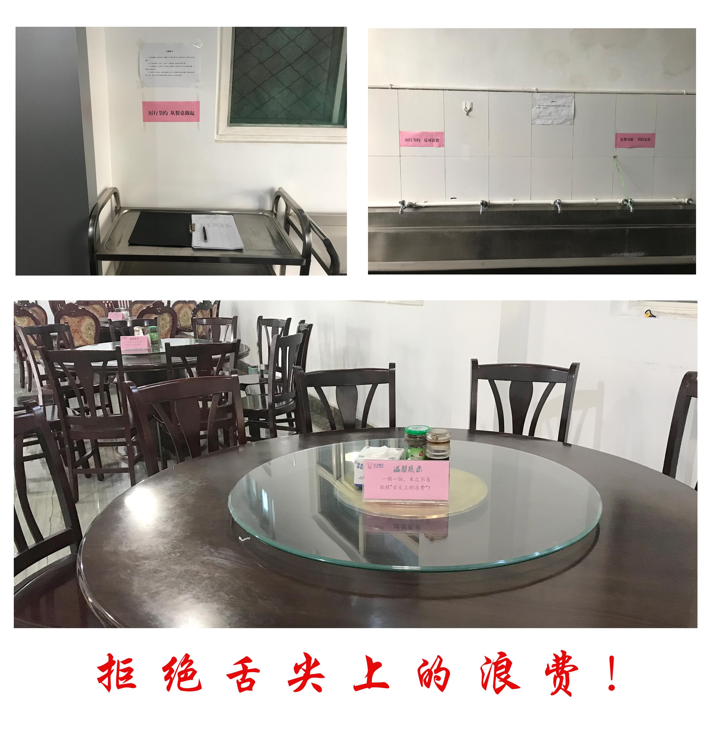 营造氛围,提示警醒。结合集团职工餐厅实际,首先以职工餐厅为“场点”进行布置和选位;其次在不影响整体环境效果的情况下,在餐具清洗、就餐签字、打饭窗口等醒目位置张贴了“按需取食、杜绝浪费”、“厉行节约、反对浪费”、“浪费可耻、节约为荣”、“厉行节约、从餐桌做起”等倡导性的宣传标语;再则在每张餐桌上摆放了“一粥一饭、来之不易”和“拒绝‘舌尖上的浪费’”温馨提示牌,迅速在集团“职工餐厅”营造了“拒绝餐饮浪费、崇尚节俭新风”的浓厚氛围,同时也提示警醒了个别不自觉人员。