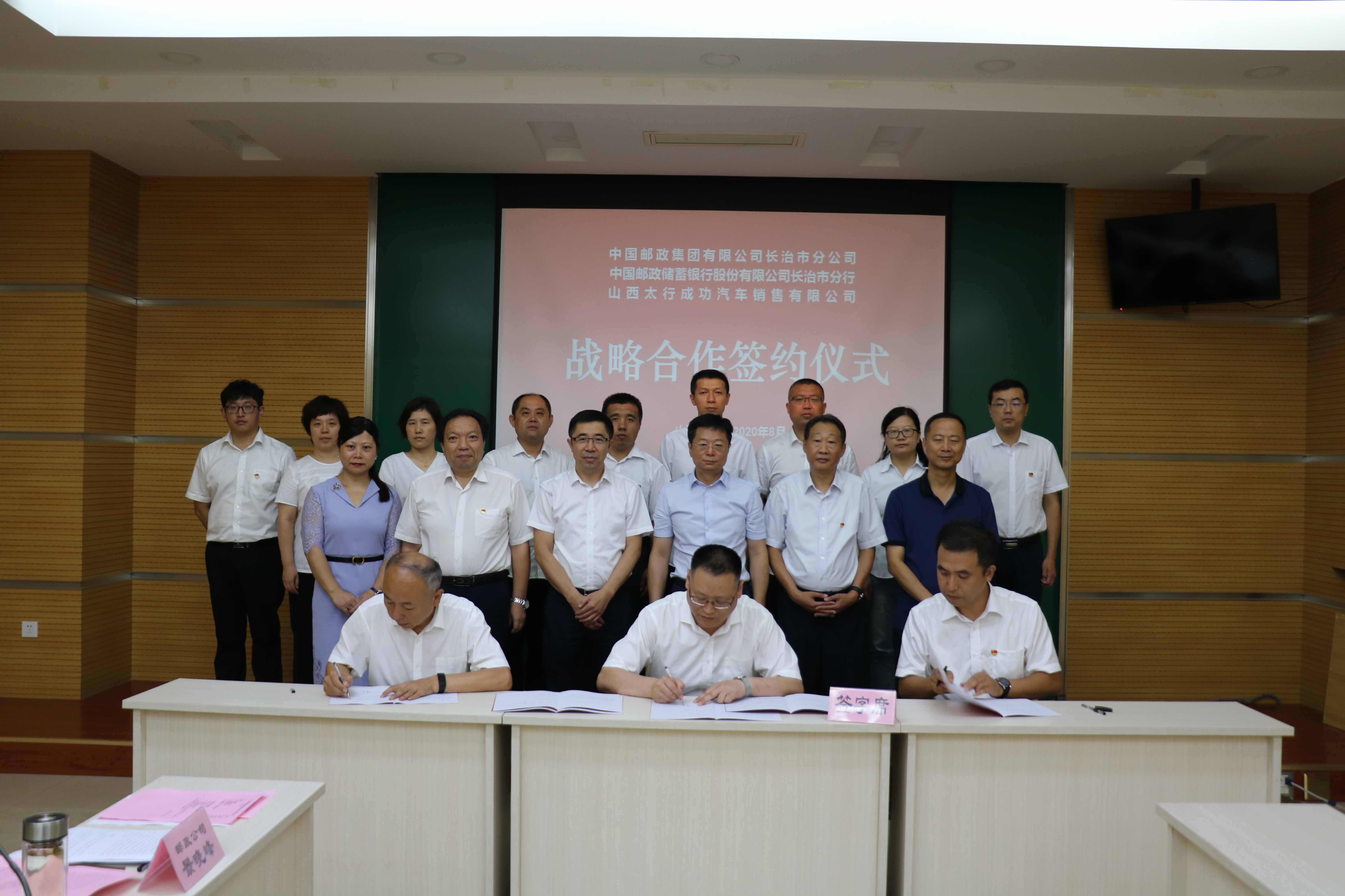 成功汽车销售公司与中国邮政集团公司长治市分公司、中国邮政储蓄银行股份有限公司长治市分行的战略合作签约仪式于8月13日上午在中国邮政长治分公司会议室隆重举行。中国邮政长治分公司总经理王宝明、邮储银行长治分行行长田鸥和Bwin必赢网站入口副总裁马帅、Bwin必赢网站入口汽车事业部副总经理、成功汽车销售公司总经理雷伟以及成功汽车销售公司副总经理田林、财务总监程孔香等出席了签约仪式。