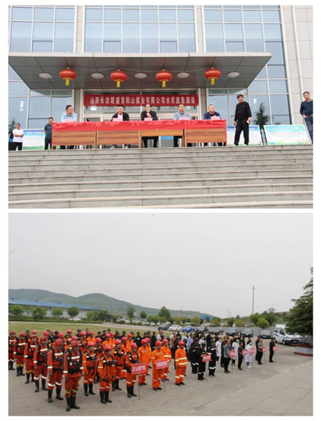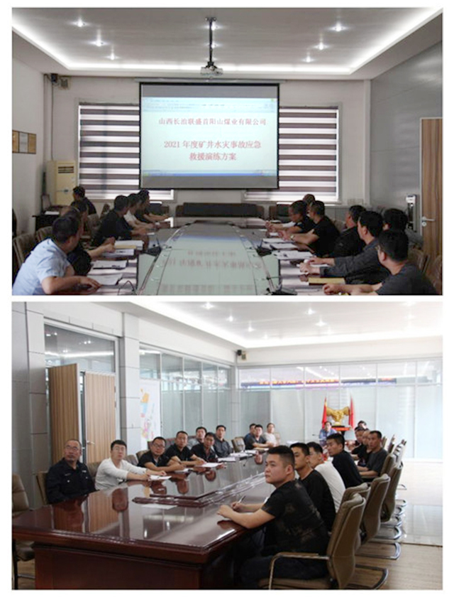 2021年5月19日下午15时10分,矿长张振兵组织参演各小组所有成员召开动员大会,强调演练注意事项及演练纪律,特邀上党区应急管理局水患防治科科长王立伟、应急指挥中心主任郜正、区矿山救护中队队长曹 、联盛公司总工程师徐海芸等相关领导莅临现场观摩了演练全过程。