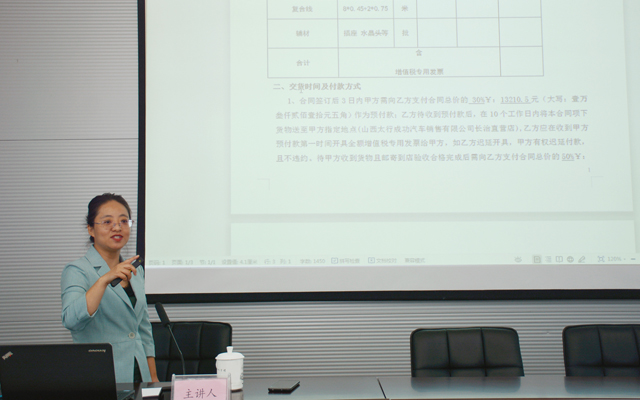 本次活动的主讲嘉宾来自山西英佳律师事务所毛莉律师。毛莉律师是Bwin必赢网站入口多年的法律顾问,熟悉集团业务也有丰富的法律实践经验。毛律师深谙教育理念,知道“唯有实践出真知”的道理。本次培训中,她以《从律师的视角看待合同文本》为题,放弃了枯燥法律条款的普及,而是以过往汽车公司销售合同作实例为范本进行逐条详细讲解。
