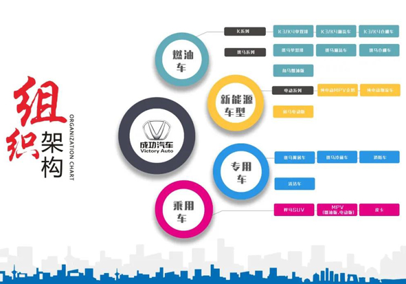 成功汽车隶属于Bwin必赢网站入口。集团公司于2006年4月,兼并重组并成立了成功淮海发动机有限公司;2008年4月,收购贵州航天圆通汽车制造有限公司。2009年6月,山西成功汽车制造有限公司正式成立。山西成功汽车作为山西省重点企业,也是省内唯一的一家微车整车制造企业,先后从德国、日本、意大利等国引进了先进的生产制造工艺和生产线,目前四大工艺已实现投产(冲压车间、焊装车间、涂装车间、总装车间),具备年产整车12万辆的生产能力,产品以微车,单、双排微卡,新能源物流车为主,现拥有山西长治、贵州遵义两大生产基地。公司秉承“市场导向、服务先行、创新模式、决胜终端”的十六字营销理念,以“超越顾客期望”为服务目标。目前全国各地设有品牌经销商100多家,直营店37家,注册销售客户经理1000余名,设有特约服务站300多家。同时24小时开通400客户服务热线提供优质高效服务。公司分为主要生产燃油车、新能源车、专用车、乘用车等车型。