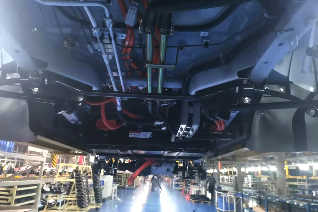 总装部内饰工位在技术人员的指导下,协同安装了车辆的低压线束、仪表台、大灯、三合一、整车控制器等零部件,底盘工位安装了电动车最核心的部分电池包、后桥、电机高压线束、水泵、管路等零部件,最终段工位为电动车安装了座椅,转向管柱等零部件,并为车辆加注了冷却液、制动液。