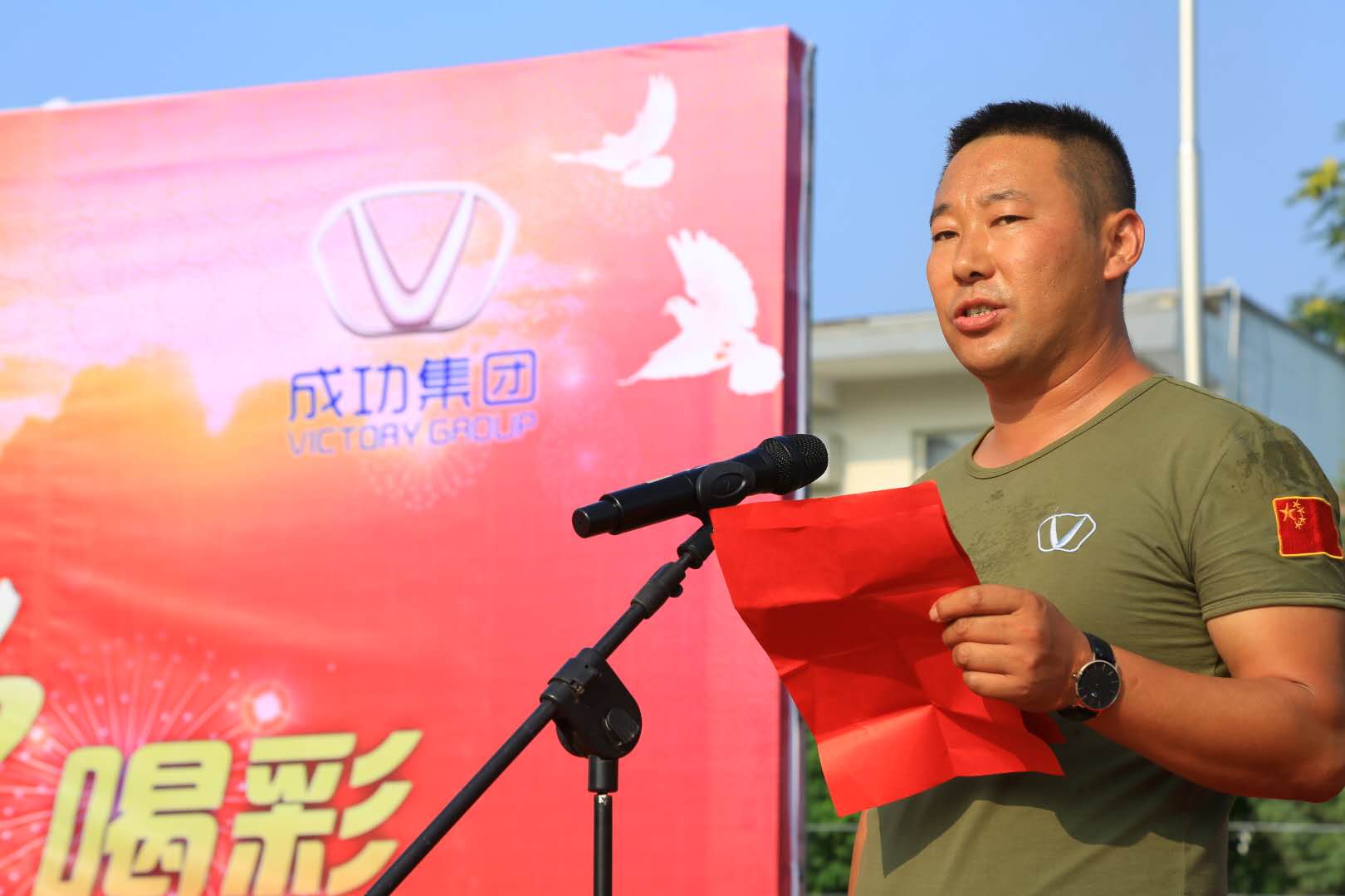 活动在奏唱《中国人民解放军军歌》后举行了分列式表演。国旗护旗队、集团旗护旗队;联盛公司方队、集团联队、焊装方队、涂装方队及特效生方队依次通过观摩台,整齐划一、铿锵有力的步伐亮出了成功人威武的英姿和展示了成功人气宇轩扬、砥砺奋进的时代风貌,引起了全场一阵阵热烈的掌声。《强军战歌》、《战友之歌》、《一二三四歌》、《团结就是力量》嘹亮的歌声回荡在集团总部的上空,各方队合唱、拉歌似排山倒海一浪高过一浪。再一次显示了成功人走进新时代,创造新辉煌的决心和永不服输的英雄气概。原兰州军区空9军36师榆林场站班长、联盛公司供应部部长马小东代表复转军人发了言;原海军航空兵学院二基地司令员、集团航空事业部总经理陈建法代表集团讲了话。他说,今天Bwin必赢网站入口隆重集会,庆祝“八一”节日,缅怀军队历史,追思军旅岁月。我们要永远铭记,是军队培养了我们,给了我们红色基因、铁血豪情,我们要用这笔宝贵财富,书写Bwin必赢网站入口美丽乐章;我们要永远铭记,是军队造就了我们,让我们拥有了钢铁意志、不屈精神,我们要用这优秀品质,描绘Bwin必赢网站入口壮丽蓝图;我们要永远铭记,是军队教会了我们,让我们肩负了责任、担当和勇气,我们要用这钢铁脊梁,担起Bwin必赢网站入口发展创新和社会担当。他还说,历史的车轮滚滚向前,时代的潮流让我们从军营走进了Bwin必赢网站入口,为广大复转军人施展才华、建功立业提供了难得的历史机遇和广阔舞台,作为一名成功人,我们要在马国利董事长这面旗帜的感召下,秉承军人雷厉风行、严守纪律,英勇顽强、永不言弃,率先垂范、积极进取的优良作风,为成功的腾飞发展贡献力量,与成功一道走向成功,走向辉煌!